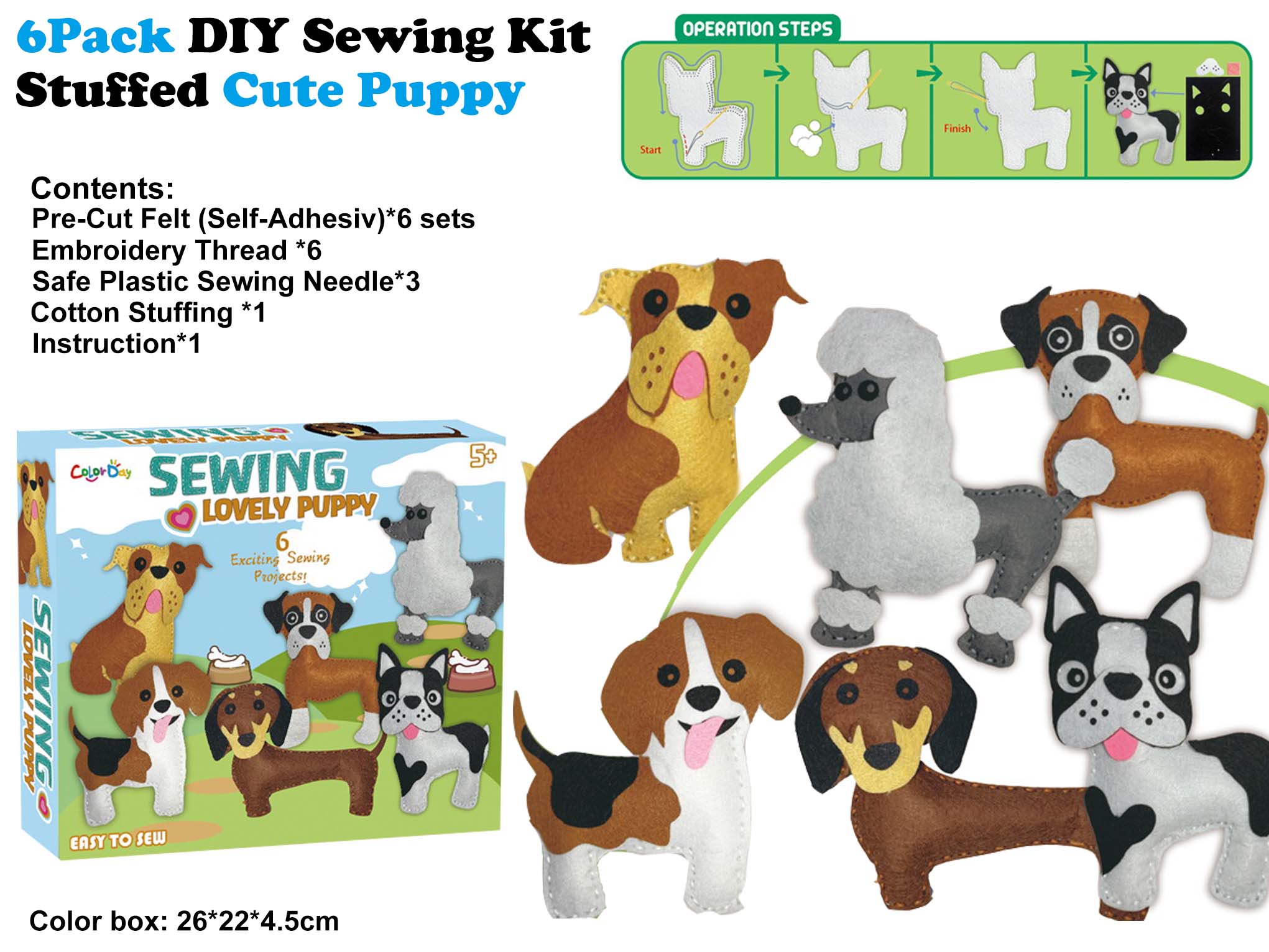 PRODUCTS Novelty Toys Novelty Gifts Novelty Stationeries Jewelry and Accessories Education and DIY Party and Seasonal Halloween Christmas Easter Others Outdoor and active toys Games Plush Others CRAFT HOME PRODUCTSEducation and DIYB482-8704 Item No : B482-8704 B482-8704_6PACK DIY FELT CUTE PUPPY SEWING KIT PACKING: 1 SET/COLOR BOX, 48 SETS/CTN/5.6' INQUIRY BACK